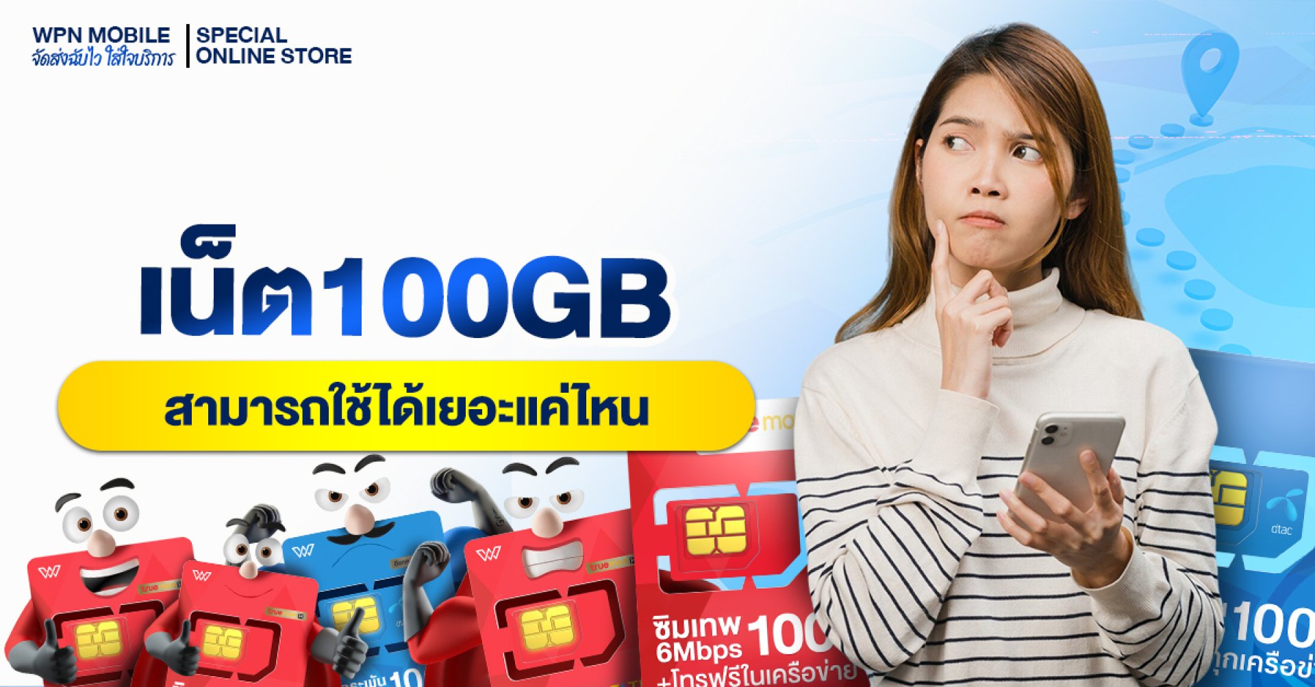 ต้องการให้แนะนำ ซิมรายปีเน็ต 100GB ที่เหมาะกับไลฟ์สไตล์คุณไหมคะ? สามารถทักแชทสอบถามได้เลยค่ะ WPN Mobile ยินดีให้บริการ