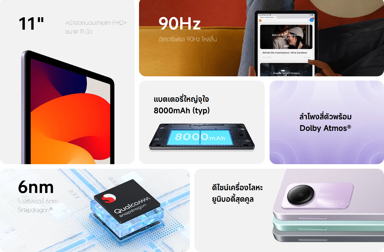 รายละเอียดสเปคเครื่อง Xiaomi Redmi Pad SE WiFi 8/256GB จอแสดงผล (Display)- จอแสดงผล TFT-LCD 24-bit (16 ล้านสี)- กว้าง 11 นิ้ว (แนวทะแยง)- ความละเอียด 1200 x 1920 พิกเซล (207 ppi)- อัตราการสัมผัสหน้าจอ 90 เฮิรตซ์ (Refresh Rate 90Hz)- ระบบสัมผัส : 180Hz touch-sensing