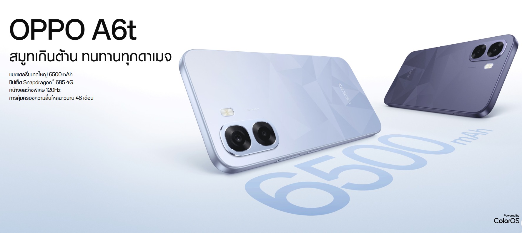 OPPO A6t สมูทเกินต้าน ทนทานทุกดาเมจ แบตเตอรี่ขนาดใหญ่ 6500mAh ชิปเซ็ต Snapdragon 685 4G ลื่นกว่า สว่างกว่า ดีกว่า เพลิดเพลินกับความคมชัดตระการตาและการเคลื่อนไหวที่ลื่นไหลบนหน้าจอสว่างพิเศษ 120Hz ความสว่างระดับพีคทำให้มองเห็นได้ชัดเจนแม้อยู่กลางแดดจ้า